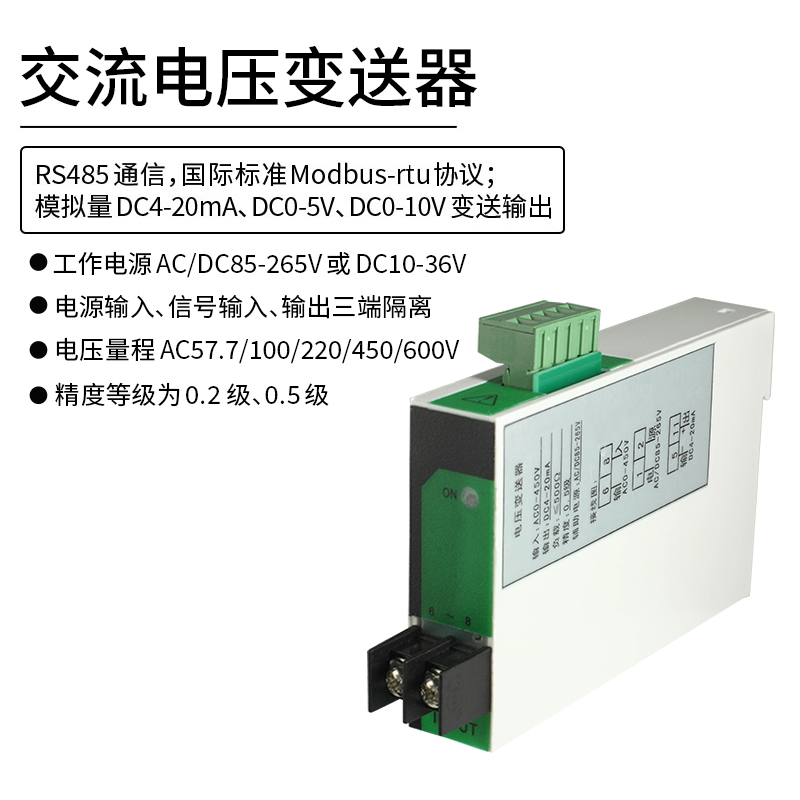 單相交流電壓變送器,是一種將電網(wǎng)中的電壓參數(shù),經(jīng)隔離變送成線性的直流模擬信號的裝置。模擬量可選:DC0~20mA、DC4~20mA、DC0~5V、DC0~10V等變送輸出。高精度測量單相交流電壓,精度達(dá)0.5%。RS485通信接口,采用國際標(biāo)準(zhǔn)Modbus-rtu通訊協(xié)議,可與各種PLC、HMI、組態(tài)軟件實(shí)現(xiàn)組網(wǎng)。