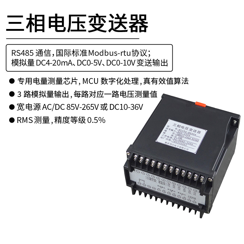 三相電壓變送器,通過專用電量芯片采樣,CPU 數(shù)字化處理,真有效值算法,高精度的測(cè)量三相電壓,隔離轉(zhuǎn)換成線性直流標(biāo)準(zhǔn)模擬信號(hào)輸出或RS485數(shù)字通信接口輸出。模擬量可選:DC0~20mA、DC4~20mA、DC0~5V、DC1~5V、DC0~10V等變送輸出;RS485數(shù)字通信接口,采用國(guó)際標(biāo)準(zhǔn)Modbus-rtu通信協(xié)議,可與各種PLC、HMI、組態(tài)軟件實(shí)現(xiàn)組網(wǎng)。
