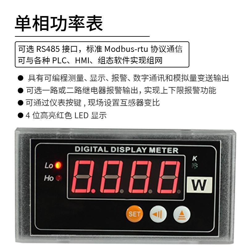 HY194系列數(shù)顯單相交流功率表,是一種具有可編程測(cè)量、顯示、報(bào)警、數(shù)字通訊和模擬量變送輸出等功能的智能儀表,廣泛應(yīng)用于變電站自動(dòng)化、配電自動(dòng)化、智能建筑、自動(dòng)化生產(chǎn)線、測(cè)試臺(tái)等。互感器變比可通過(guò)儀表按鍵現(xiàn)場(chǎng)設(shè)置,使用方便靈活。4位高亮紅色LED顯示;可選一路或二路繼電器報(bào)警輸出,實(shí)現(xiàn)上下限報(bào)警功能;可選RS-485數(shù)字通訊接口,采用國(guó)際標(biāo)準(zhǔn)MODBUS-RTU通訊協(xié)議,可與各種PLC、HMI、組態(tài)軟件實(shí)現(xiàn)組網(wǎng);可選模擬量(DC0~20mA、DC4~20mA、DC0~5V、DC0~10V等)變送輸出。
