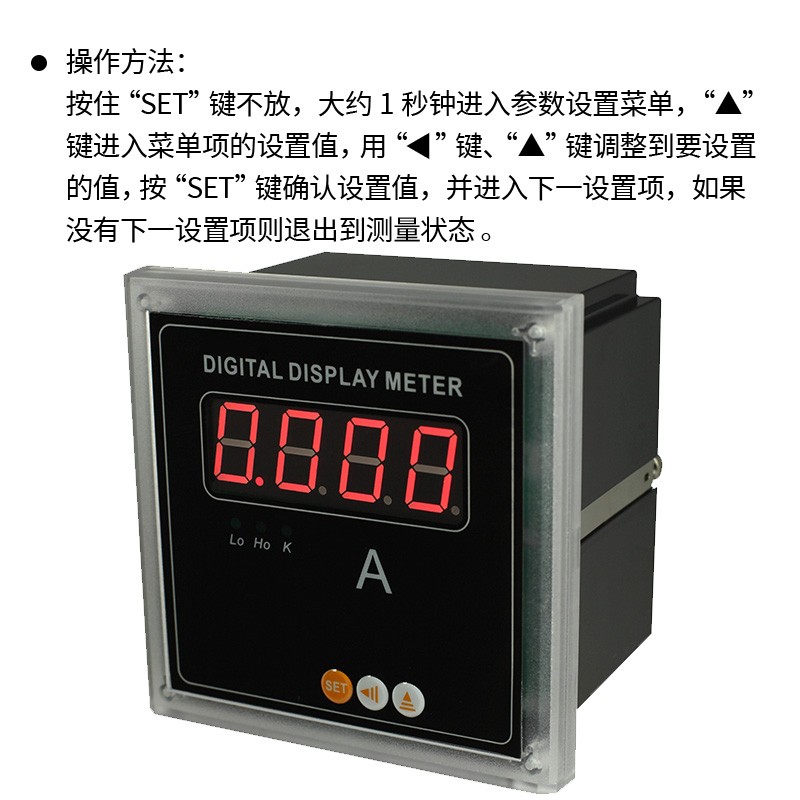 按住“SET”鍵不放,大約1秒鐘進(jìn)入?yún)?shù)設(shè)置菜單,“▲”鍵進(jìn)入菜單項(xiàng)的設(shè)置值,用“?”鍵、“▲”鍵調(diào)整到要設(shè)置的值,按“SET”鍵確認(rèn)設(shè)置值,并進(jìn)入下一設(shè)置項(xiàng),如果沒有下一設(shè)置項(xiàng)則退出到測量狀態(tài)。