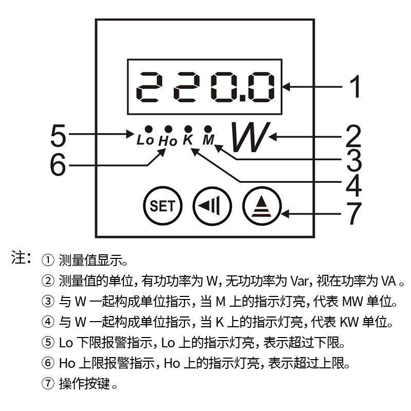 ④、與W一起構(gòu)成單位指示,當(dāng)K上的指示燈亮,代表KW單位。